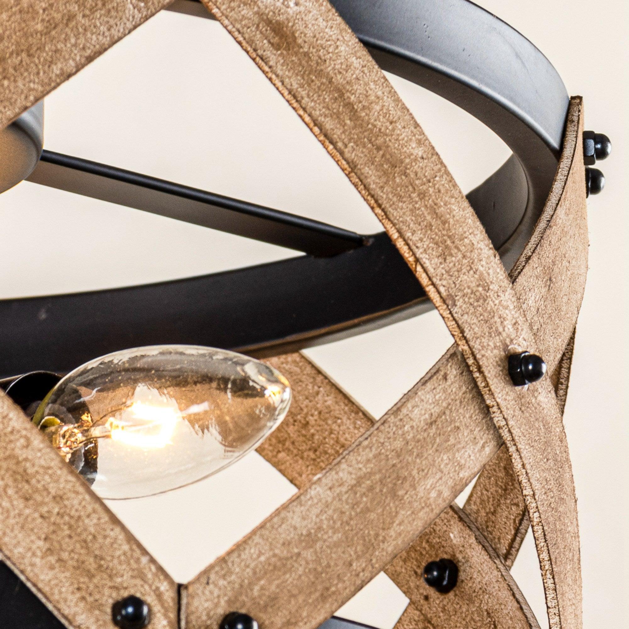 - Industrial Design: Features a round open frame made of wood slats, accentuated by a matte black metal canopy.