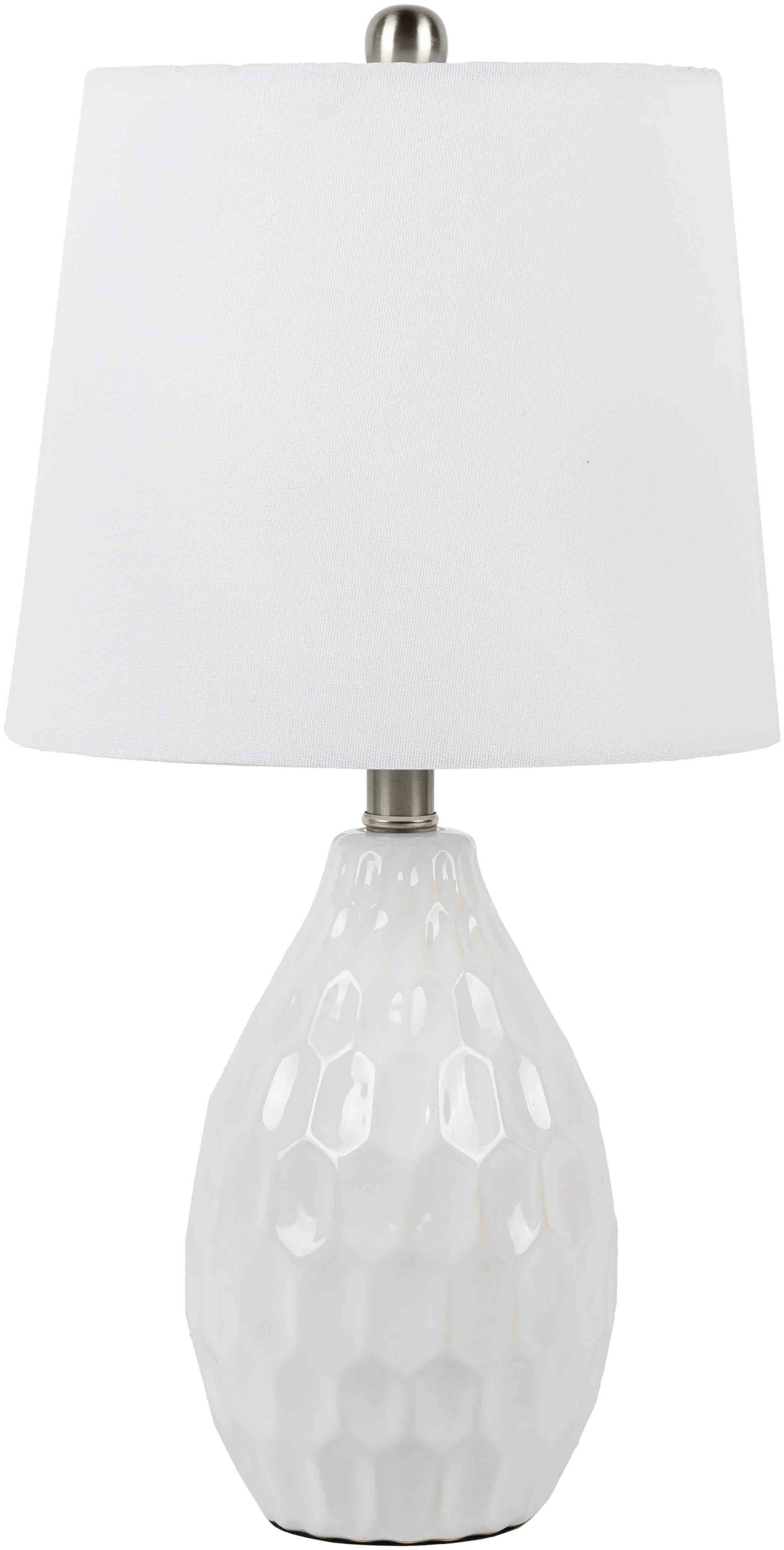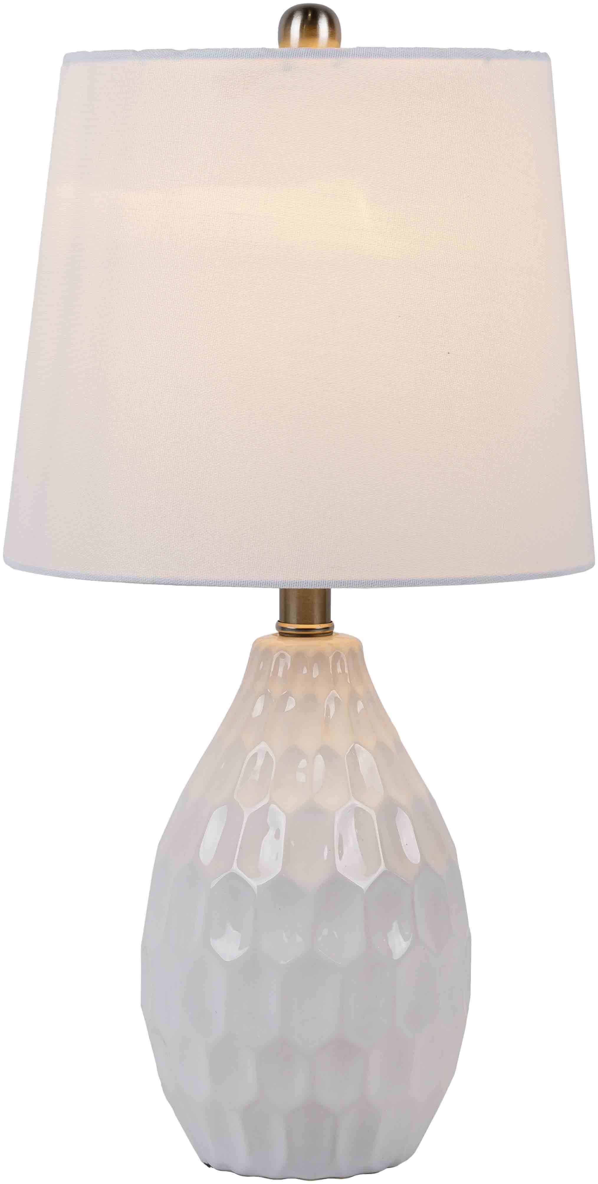- Finish: White glazed ceramic body, white linen shade, iron finial