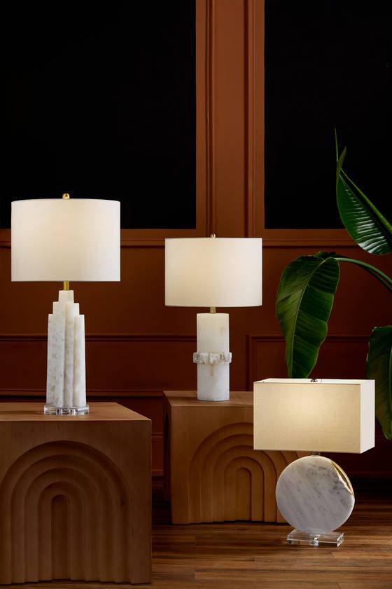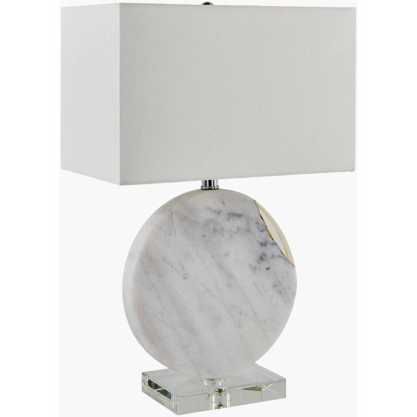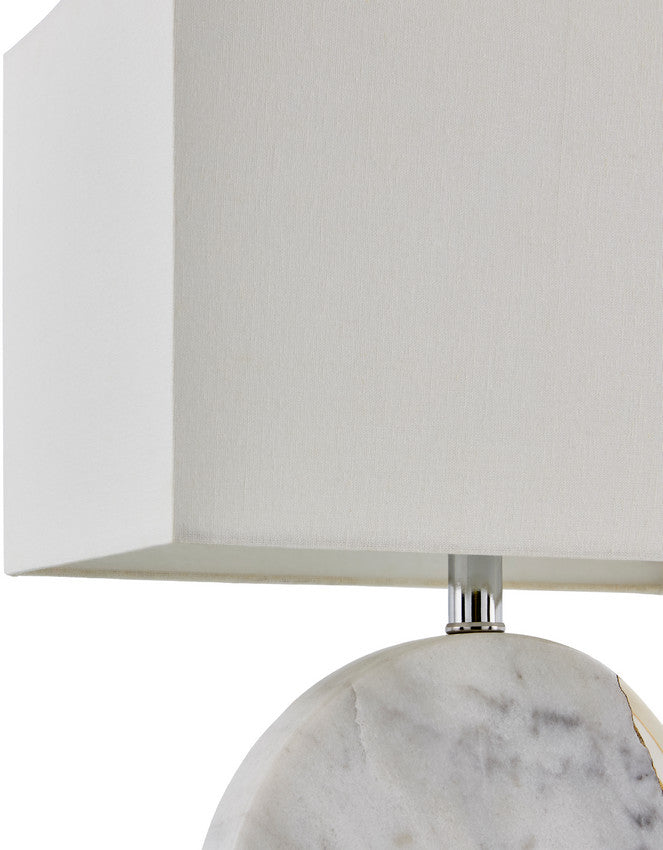- Material: Body: Marble, Resin; Base: Crystal; Shade (Outside): Linen; Shade (Inside): Plastic; Finial: Iron