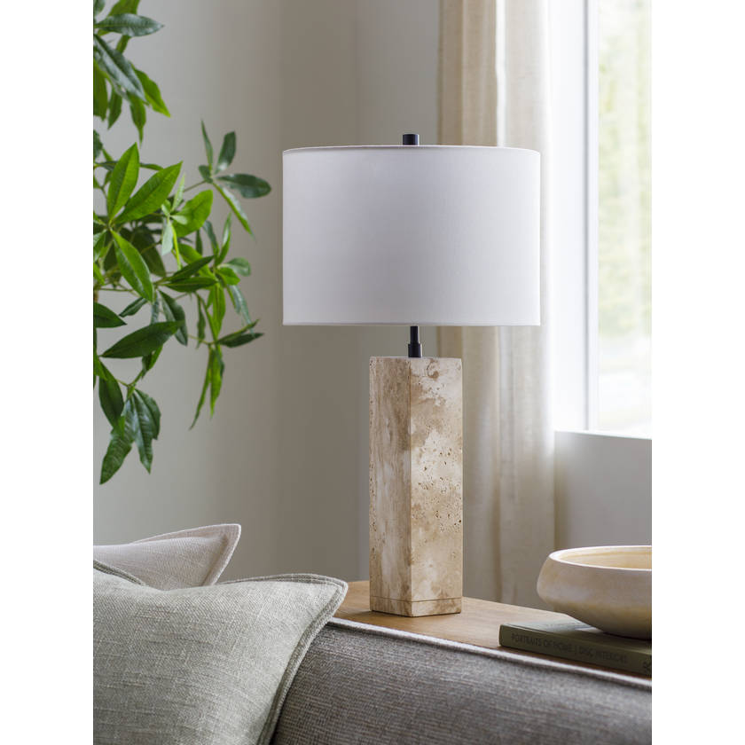 Illuminate your space with a touch of Industrial Rustic charm by adding the Goderich Accent Table Lamp to your home decor. Constructed with a stunning Travertine body and a durable Metal finial, this lamp exudes a robust and earthy appeal that can enhance any room's aesthetic. The lamp is complemented by an exterior Linen shade and an interior Polyester shade, which work together to diffuse warm, inviting light throughout your space. Standing at 28 inches tall, this accent table lamp makes an impressive statement on its own while seamlessly blending into your existing decor. With its unique combination of materials and textures, the Goderich Accent Table Lamp is more than just lighting - it's a piece of art that illuminates.