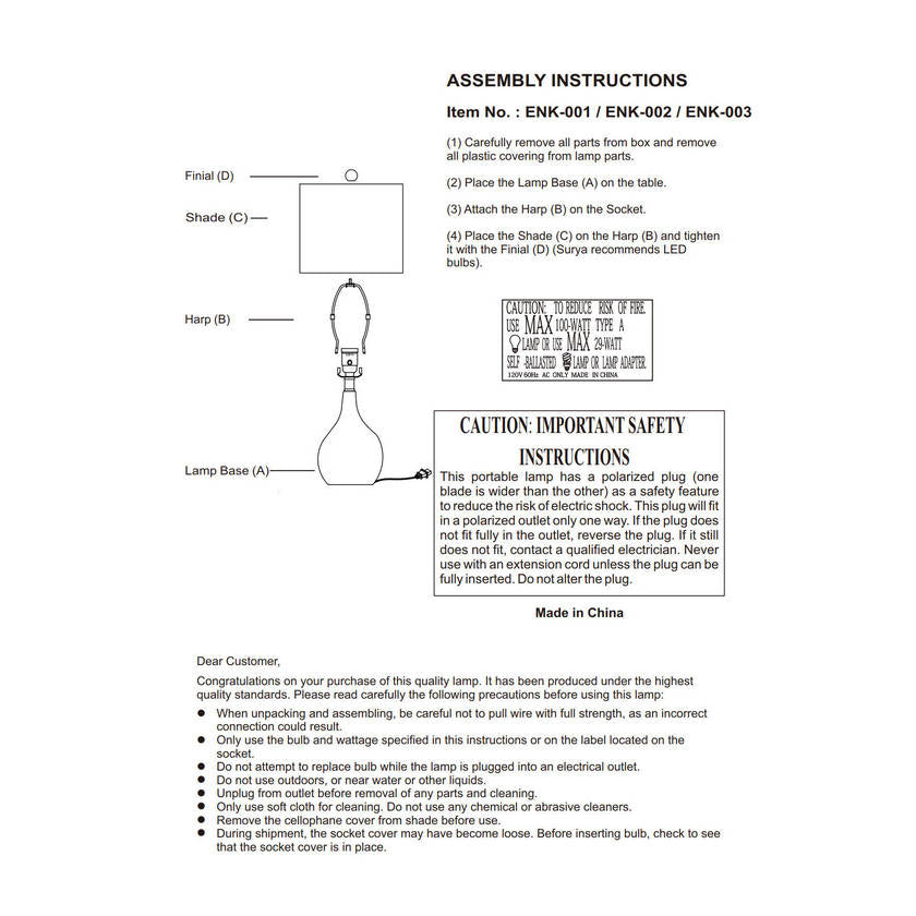 - Colors: Body: Black; Shade: White; Finial: Black; Harp: Metallic - Gold; Cord: Translucent