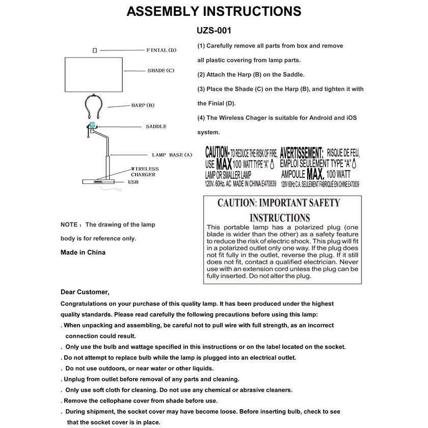 - Colors: Body: Black; Base: Black; Shade: White; Finial: Metallic - Brass; Harp: Metallic - Brass; Cord: Translucent
