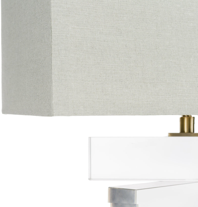 - Body: Clear; Base: Clear; Finial: Clear; Harp: Metallic - Brass Linen Shade