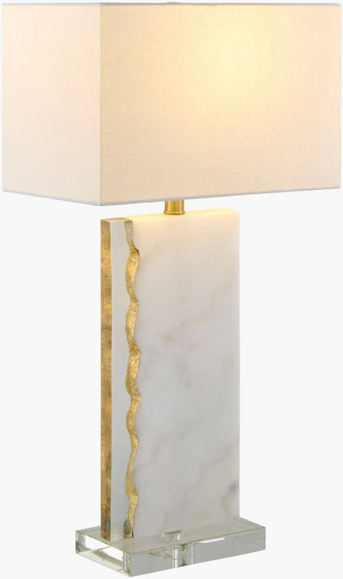- Material: Body: Marble, Resin; Base: Crystal; Shade (Outside): Linen; Shade (Inside): Plastic; Finial: Iron